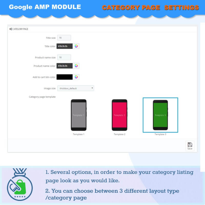 Le module permet la génération automatique des pages de catégories, des produits, de l’indice. Nous nous sommes assurés que vous pouvez facilement modifier chacun des éléments qui apparaissent dans ces pages. Afin de suivre toutes les exigences d'un site de commerce en ligne, nous avons séparément développé une partie du menu AMP et une section AMP pour des résultats générés par la recherche.section.